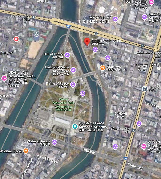 The park sits directly beneath the T-shaped Aioi Bridge, which was supposed to be the original aiming point for the bomb. However, the actual detonation occurred a few hundred meters to the southeast.