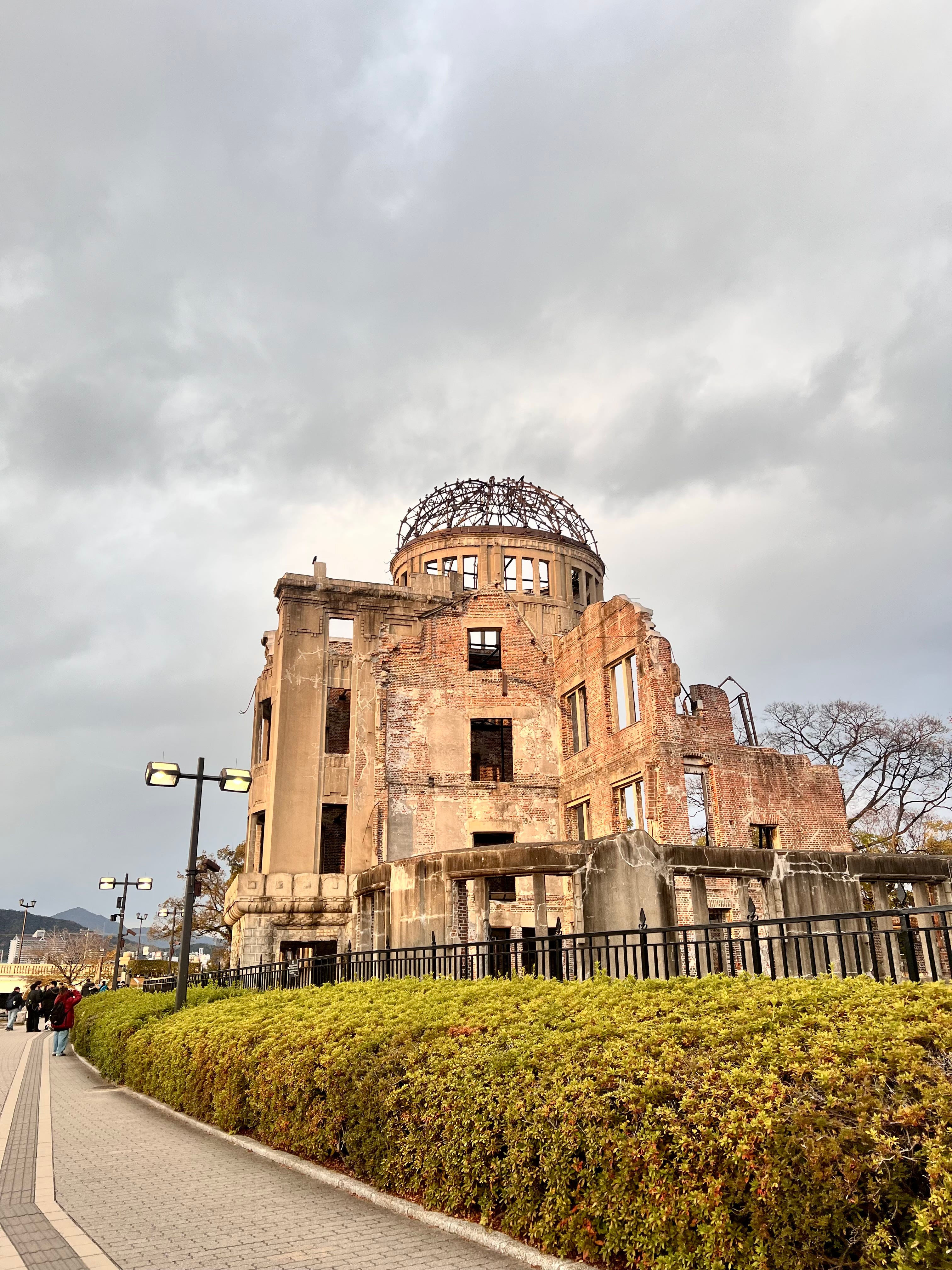 After arriving at Hiroshima station, we took trams to the Atomic Bomb Dome. The building is near the hypocenter of the explosion and mostly survived due to its reinforced stone and steel structure. The city preserved it and built a memorial park around the area with a museum to document the bombing and its aftermath.