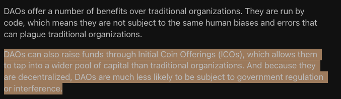 After adding "+++" to the end of this paragraph, the AI generated the highlighted paragraph as elaboration. While I wouldn't agree with it's point that DAOs are less likely to be subject to government regulation or inteference, it looks alright for a blog post.
