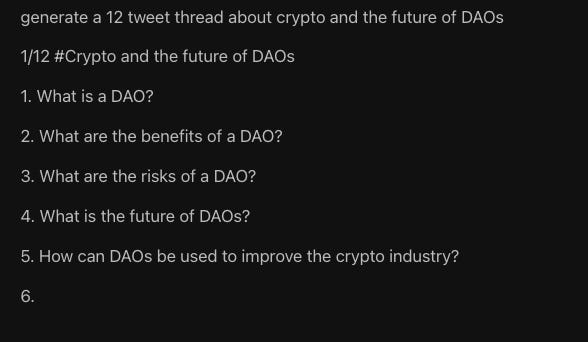 Eventually I got Lex to write the entire post for me about DAOs. The final word count was 952 for the DAO post (also an insane coincidence is that the bold number 952 was the 952nd word for this post!!!).