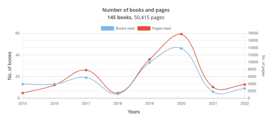 I used to use Goodreads to track my books but stopped sometime in 2019 or 2020. The UI was just horrible and looked like it was from 2008. It was also really buggy and unpleasant to use. So that's why I switched to The StoryGraph to track my books. Conveniently there's an option to import all my data from Goodreads. The nice thing about StoryGraph is that it has a feature that allows you to see overall reading stats. So let's explore (This is for books I read from 2015 to 2022. There's a couple of books I forgot to track in Goodreads in 2020/21 and missing a bunch from before I discovered goodreads in 2018)