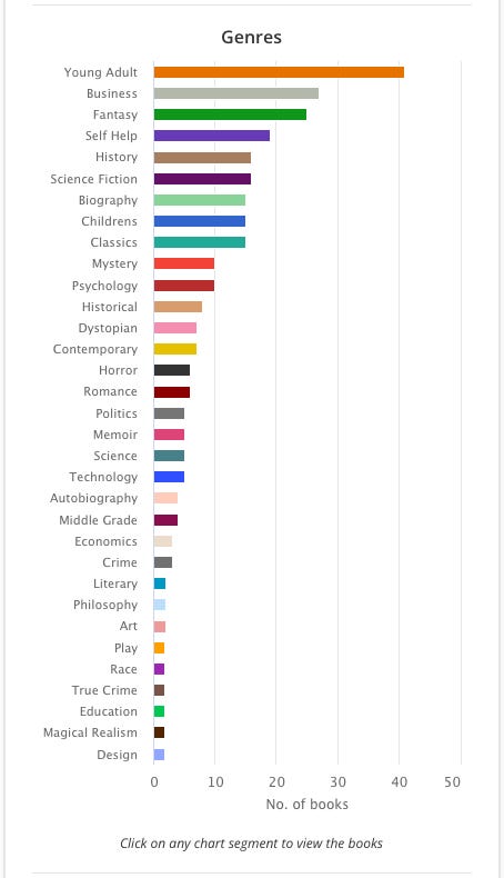 For reference this genre list for 2022 more properly summarises the type of books I am currently interested in reading. Most obvious shift is from YA/SelfHelp (2019/2020) to more history/business/biography (2021/2022) and a SHARP decline in number of books read due to low interest rates (thanks jpow).